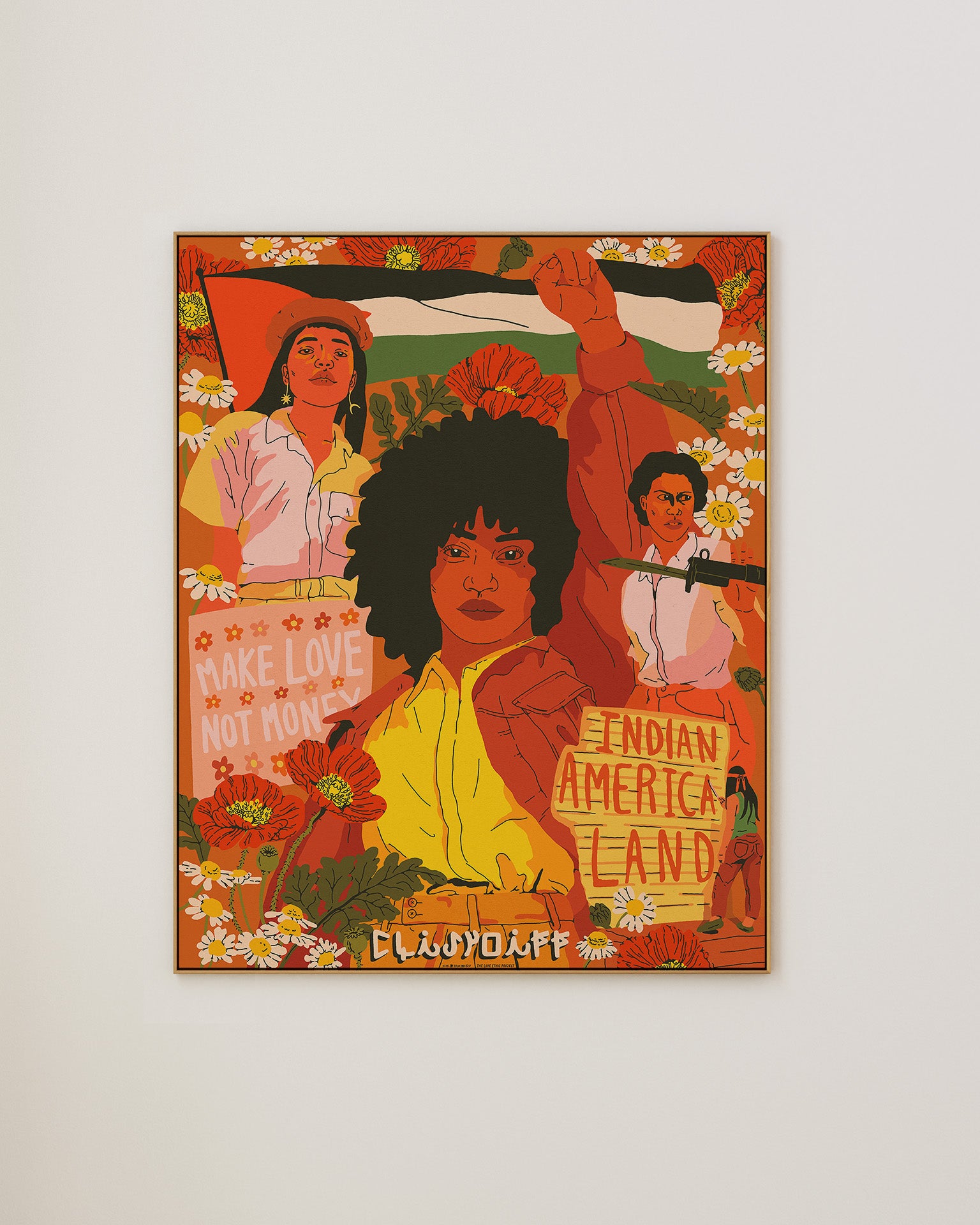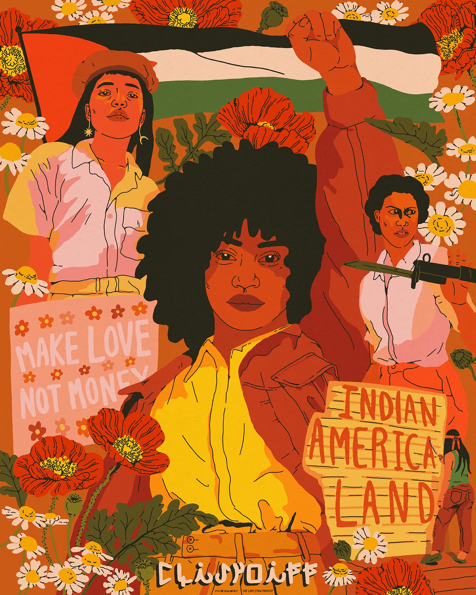 This limited-edition 16x20 poster collaboration by artists Anwulika Anigbo of The Love Ethic Project and Chi Nwosu explores the intertwined narratives of the flower children of the 1960s and the concurrent liberation struggles for sovereignty and equal rights among Black, Indigenous, Palestinian, and Chicana women.